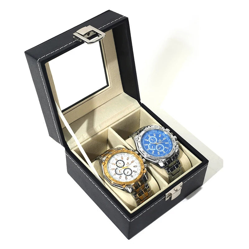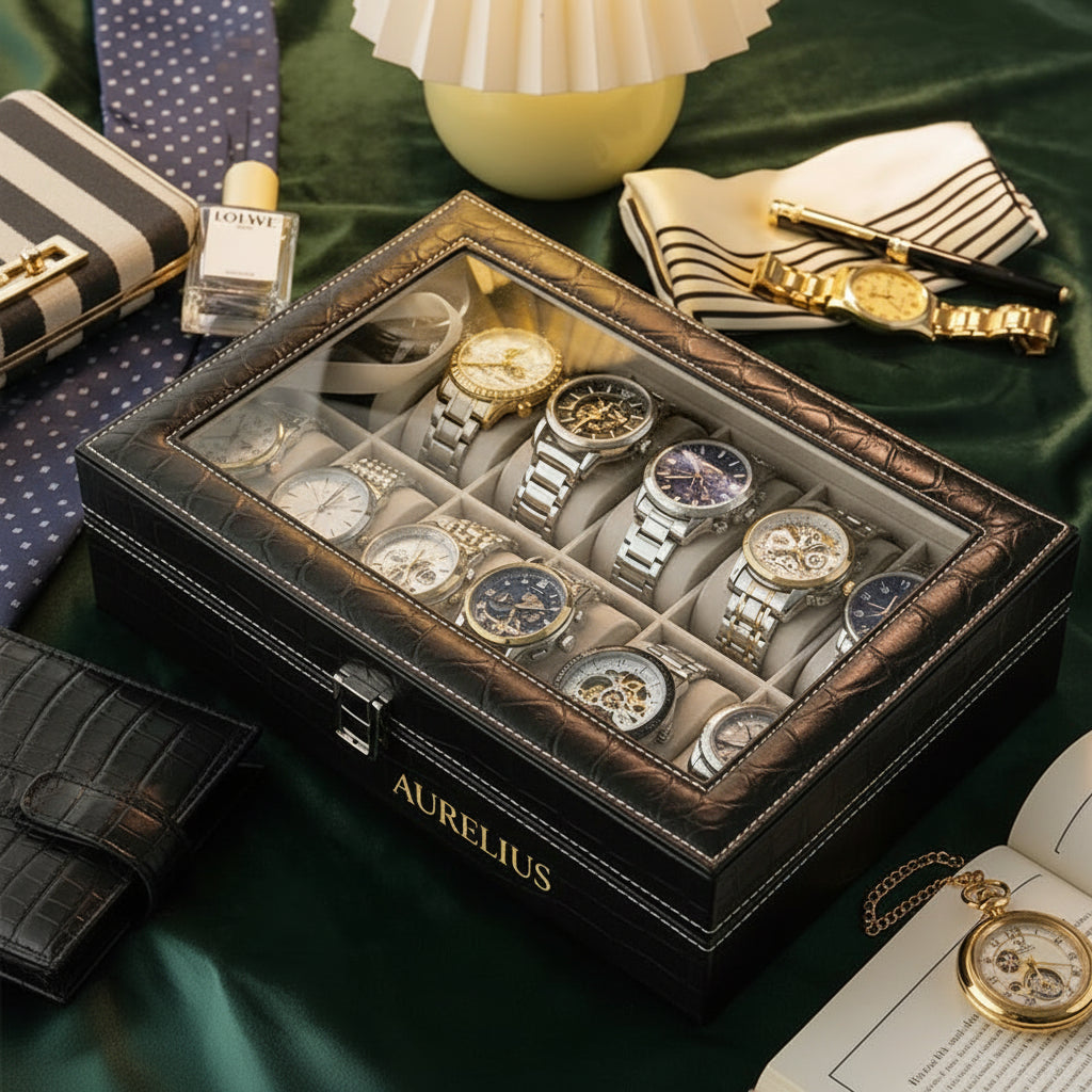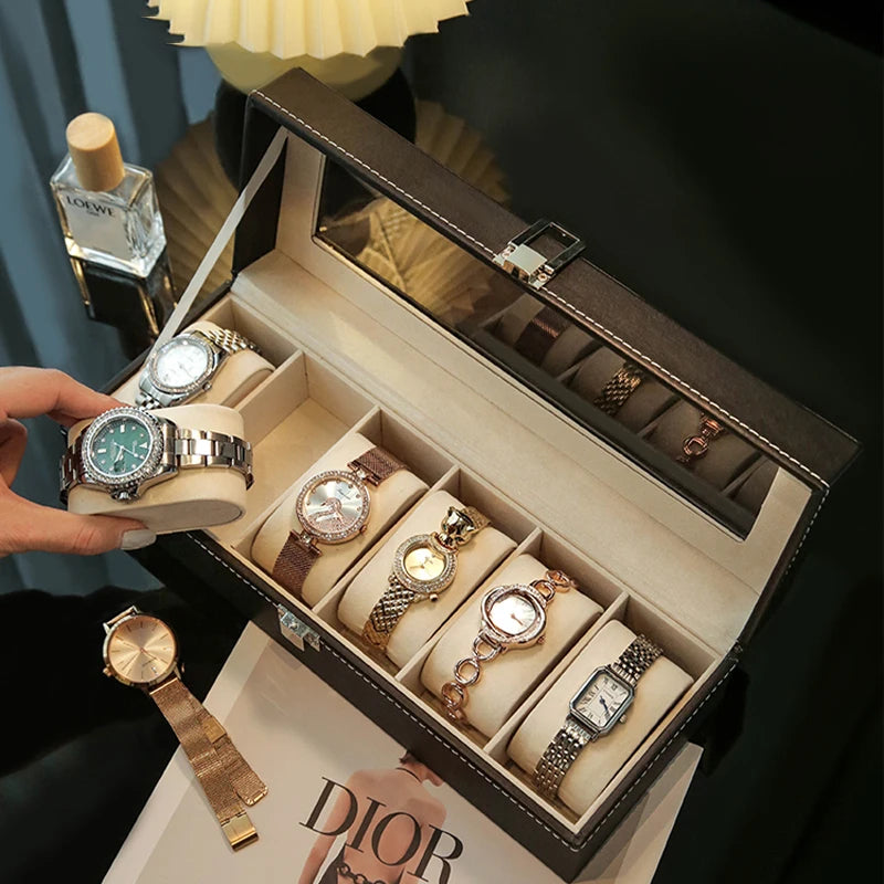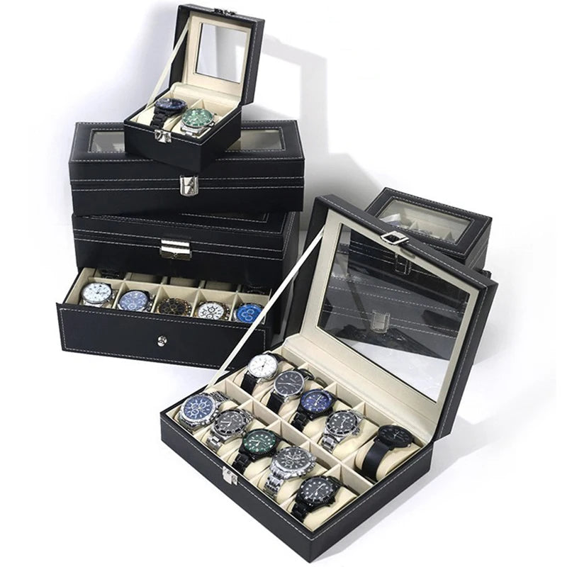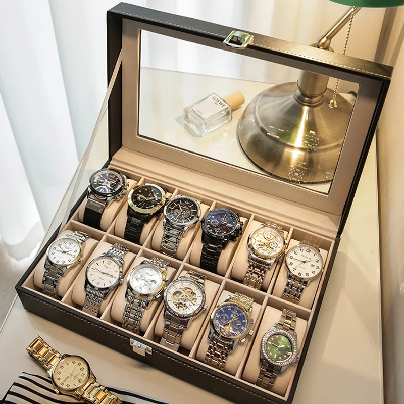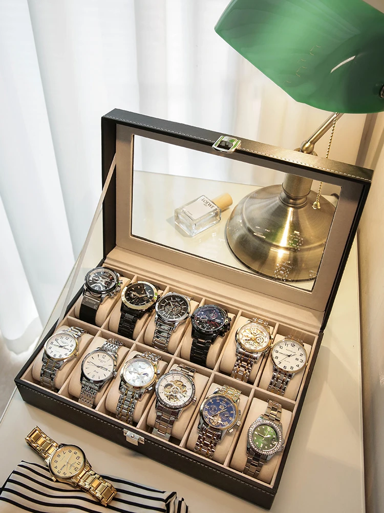 תצוגת שעוני עור יוקרתית אחסון אוסף ארגונית עם זכוכית עליון לתצוגה של תכשיטי שעונים לגברים ונשים קופסת תצוגה מתנות